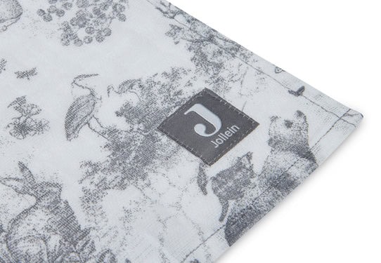 Deze leuke hydrofiele doeken hebben het schattige all over printje van het Pimpelmees x Jollein bosdieren thema. De ondergrond is off white en de print is gedrukt in een warme grijze kleur.