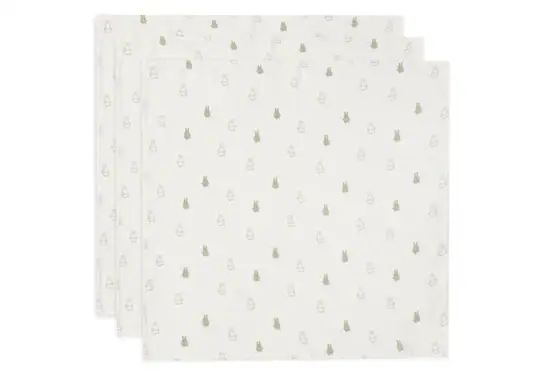 Deze leuke hydrofiele doeken hebben een schattig all-over Nijntje printje. De ondergrond is Ivory en Nijntje heeft de kleuren Olive Green en Nougat. De leuke hydrofiele doeken zijn heerlijk zacht en uitermate geschikt voor gevoelige babyhuidjes. De hydrofiele doeken shop je in small (3-pack) en large (2-pack). Zo heb je altijd een schone doek binnen handbereik!