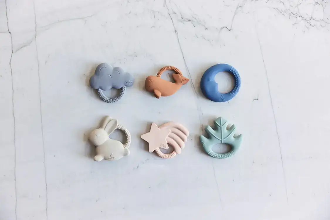 Deze bijtring kan je baby lekker in zijn mond stoppen om er op te sabbelen en te bijten. Bij doorkomende tandjes kan het extra fijn zijn om de bijtring voor gebruik in de koelkast te leggen (nóóit in de vriezer). De koude bijtring verdooft het vervelende gevoel op het tandvlees een beetje. Deze bijtring is verkrijgbaar in vier verschillende vormen. Elke vorm heeft zijn eigen kleur. Voor je baby is elke vorm makkelijk te grijpen en vast te houden. Doorkomende tandjes kunnen er voor zorgen dat je baby zich minder lekker voelt. Ook niet zo gek natuurlijk: de tand wurmt zich een weg door het tandvlees en dat doet zeer of het geeft jeuk. Vaak zie je het ook wel in het mondje: een harde bobbel en rood of gezwollen tandvlees. Het is hard werken voor jouw baby! Om de pijn iets te verzachten is het voor jouw kleintje fijn om ergens op te bijten. Dat verlicht de druk op het tandvlees bij de doorkomende tandjes. Deze bijtring van natuurlijk rubber kun je gebruiken bij alle leeftijden en is veilig voor jouw baby vanaf 0 maanden.