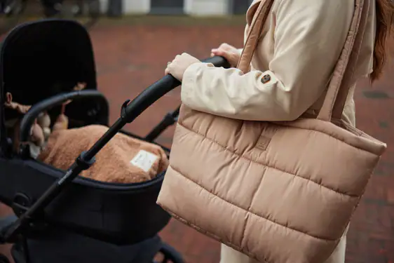 De shopper heeft extra lange hengsels zodat je deze niet alleen op je schouder kan dragen, maar ook cross-body of om de kinderwagen.