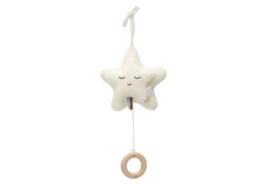 Shop deze mooie muziekhanger Star laat je kleintje genieten van de mooie klanken van het liedje lullaby van Schubert. Deze sterren in de vorm van een grote en een kleinere ster is voorzien van kleurrijke koordjes, geborduurde oogjes en een trekkoord om het muziekje mee te starten. Te leuk bij het bedje of de box.