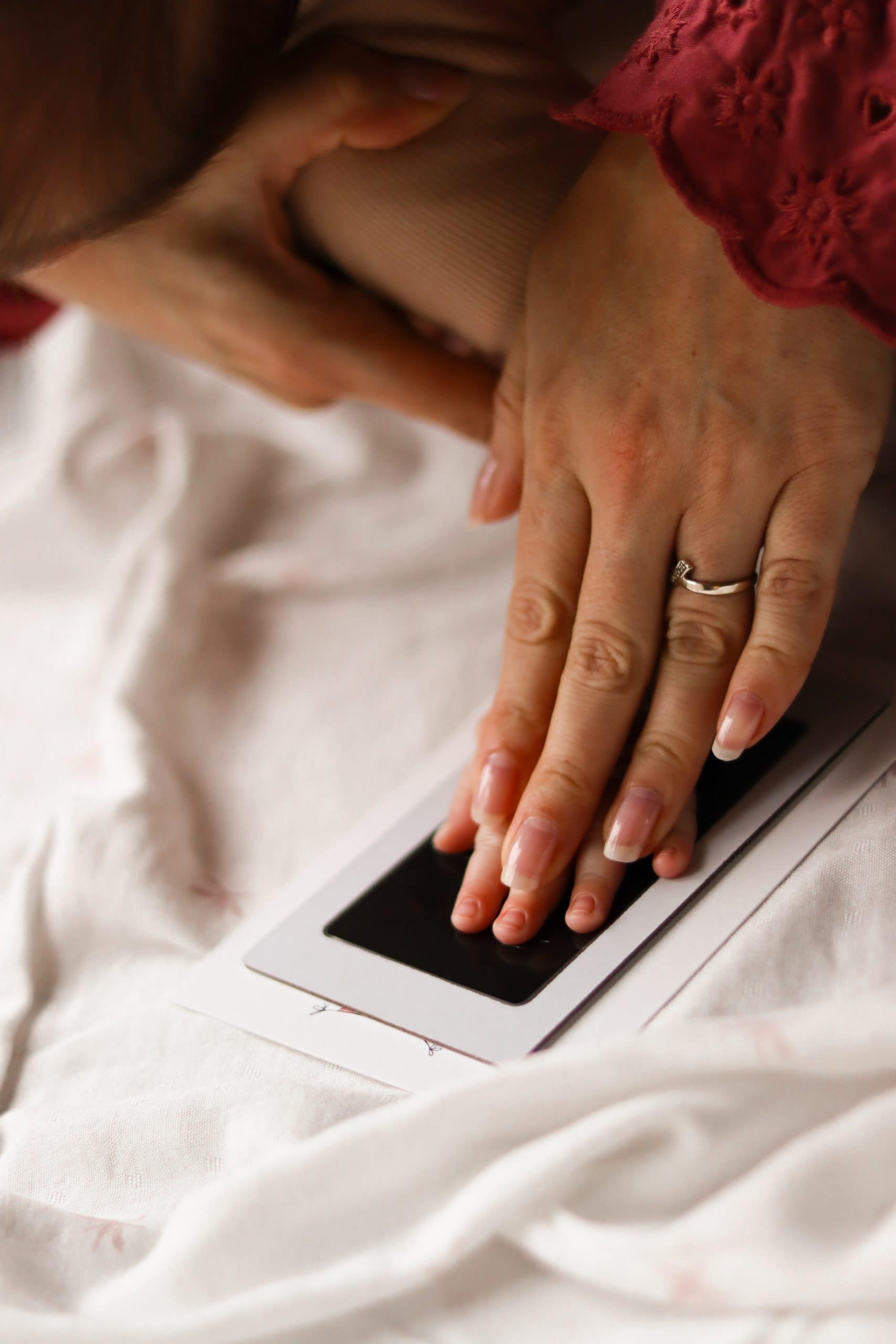 3. Plaats nu het handje of voetje van je kind bovenop de inktpad. De inkt komt niet in aanraking met de huid van je baby waardoor het veilig en makkelijk in gebruik is.