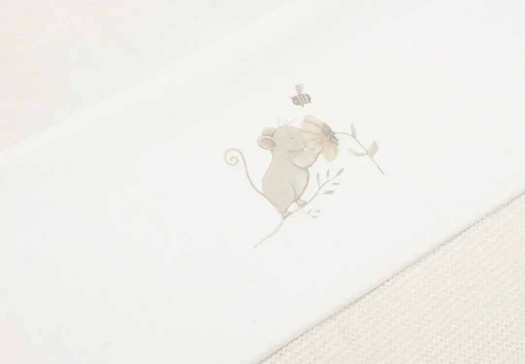 Hoe cute is dit lakentje? Het schattige muisje dat snuffelt aan een bloemetje uit hetg Dreamy Mouse thema staat afgebeeld op de boord van het lakentje. Nu je kleintje er onder ligt te slapen is het helemaal onweerstaanbaar. Combineer dit lakentje bijvoorbeeld met het Grain Knit dekentje of het dekentje uit hetzelfde Dreamy Mouse thema. Een lakentje zorgt ervoor dat jij je kleintje veilig en strak kan instoppen en het beschermt het dekentje tegen vlekjes van bijvoorbeeld spugen.