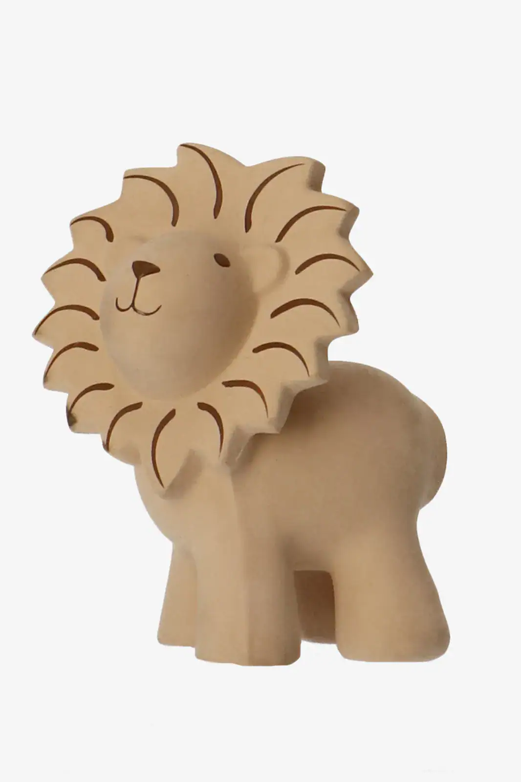Rubberen zoodiertje in leeuwvorm. Het speeltje is gemaakt van natuurlijk rubber en binnenin zit een subtiel belletje. Geschikt voor baby’s.